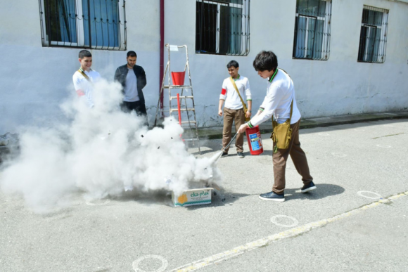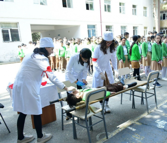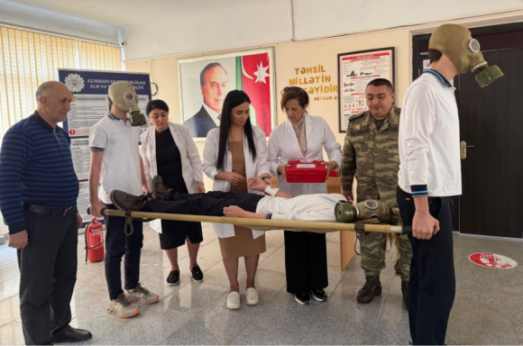 Praktiki hissədə baş vermiş şərti fövqəladə hadisə ilə əlaqədar məktəb kollektivinin təxliyəsi, “zərərçəkmişlərə ilkin yardımın göstərilməsi” və digər əməliyyatlar icra olunub.