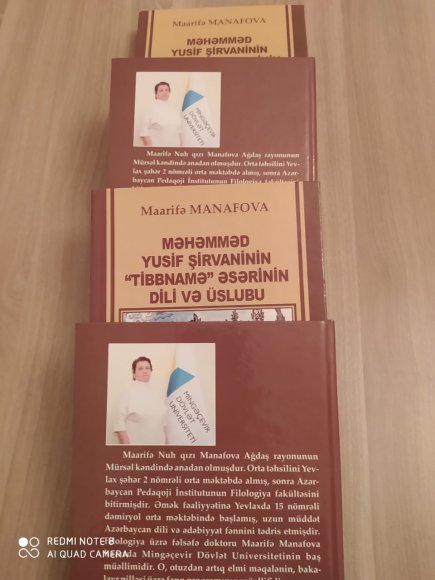 Mingəçevir Dövlət Universitetinin baş müəllimi Maarifə Nuh qızı Manafovanın “Məhəmməd Yusif Şirvaninin “Tibbnamə” əsərinin dili və üslubu” adlı monoqrafiyası “Elm və təhsil” nəşriyyat-poliqrafiya müəssisəsində nəfis şəkildə nəşr edilib.